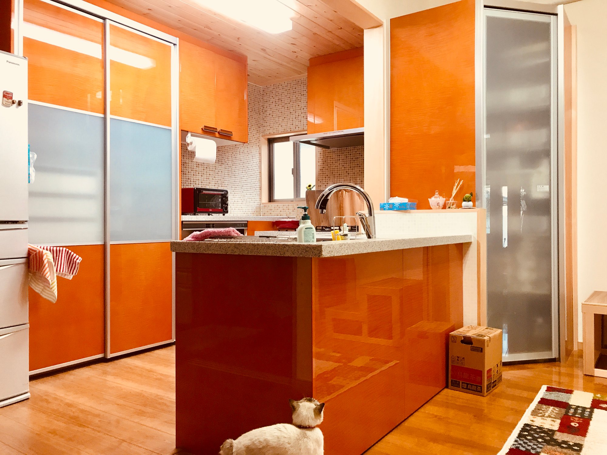 リクシルのキッチンリシェルSIへリフォームしました。色は、カーリーメープル。明るい上品な雰囲気です。中央の壁が抜けないので、壁に沿ってコーナークローゼットが設置してあります。 収納力が上がってとっても便利になった、と喜んで頂きました。