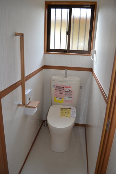 手すり、棚付紙巻器と木目調で統一感のあるトイレです。